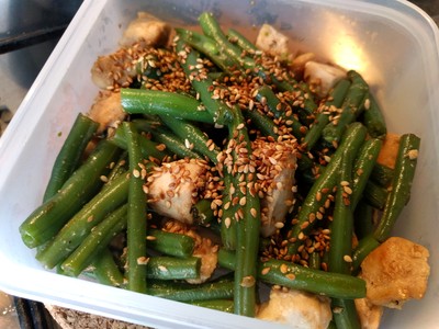 - Add the cooked green beans to the pan with the cooked chicken
